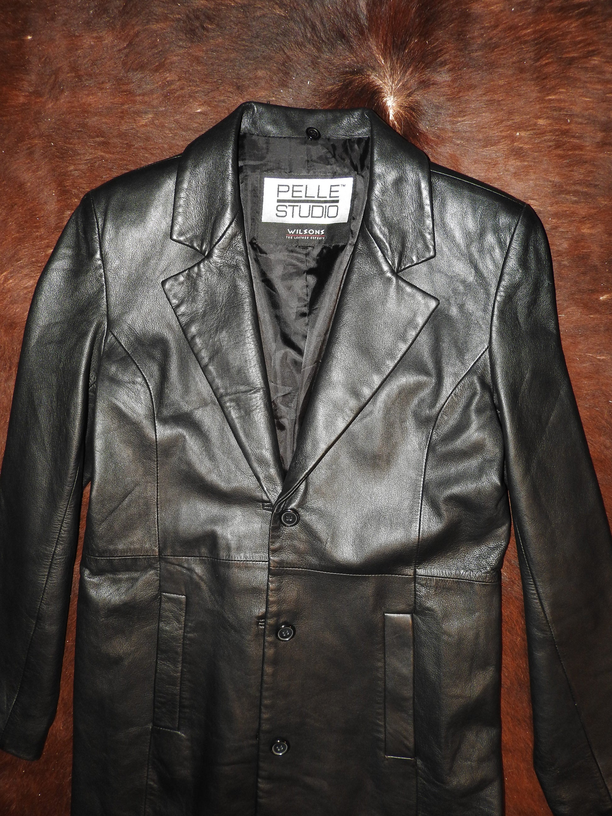 Genuine leather. 36 inch waist, 23 inch sleeve length.