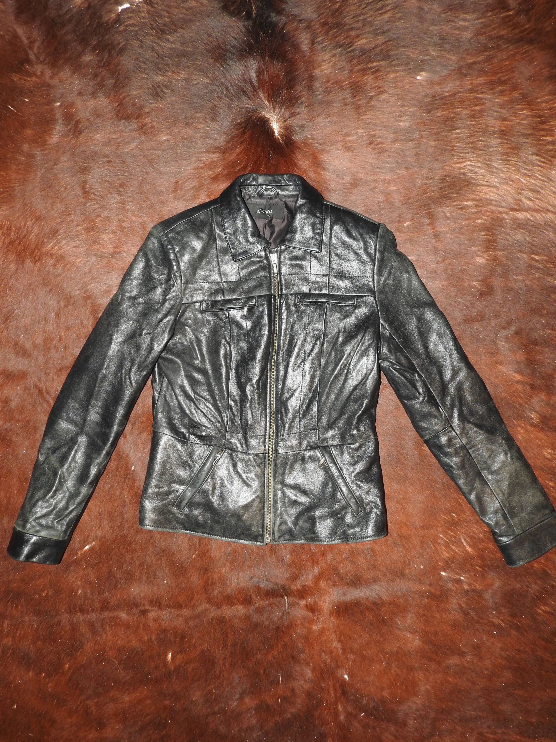 Genuine Leather. 32 inch waist, 24 inch sleeve length.
